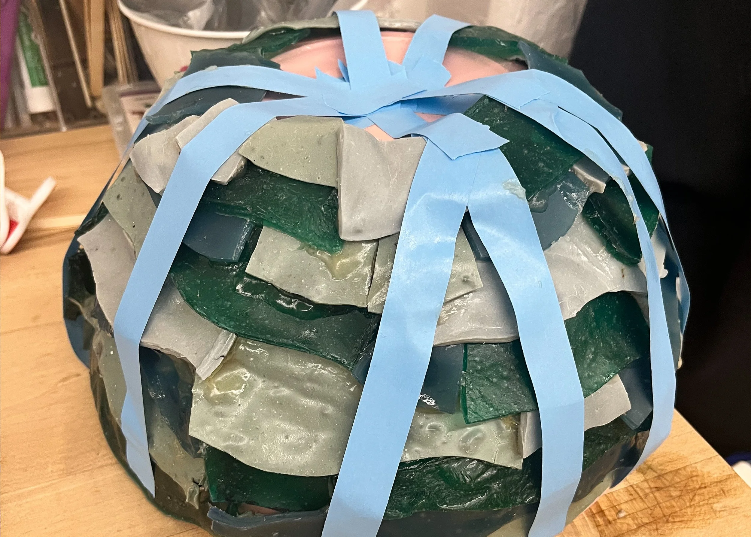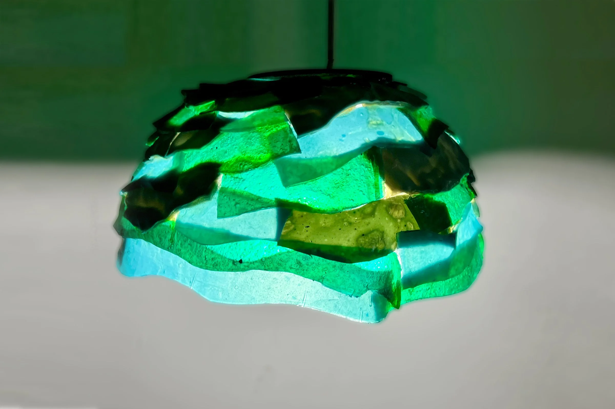 Wavy Light is an experimental lighting project that explores bioplastic as both a sustainable material and a medium for optical design. Through hands-on research, over 20 recipes were developed to achieve a custom bioplastic blend using gelatin, glycerin, vinegar, water, and lemon oil. Tapioca was used for opacity, while gelatin contributed transparency and fast-setting properties. Natural pigments such as turmeric and red cabbage introduced varied color saturation and translucency. Thin sheets were tinted in blues and greens, cut into strips, and layered over a mold to create a glowing, bowl-shaped form. The translucency of the material shifts with pigment concentration, revealing bioplastic’s sensitivity to light. Wavy Light suggests a future for bioplastics in decorative lighting that embraces both craft and sustainable innovation.