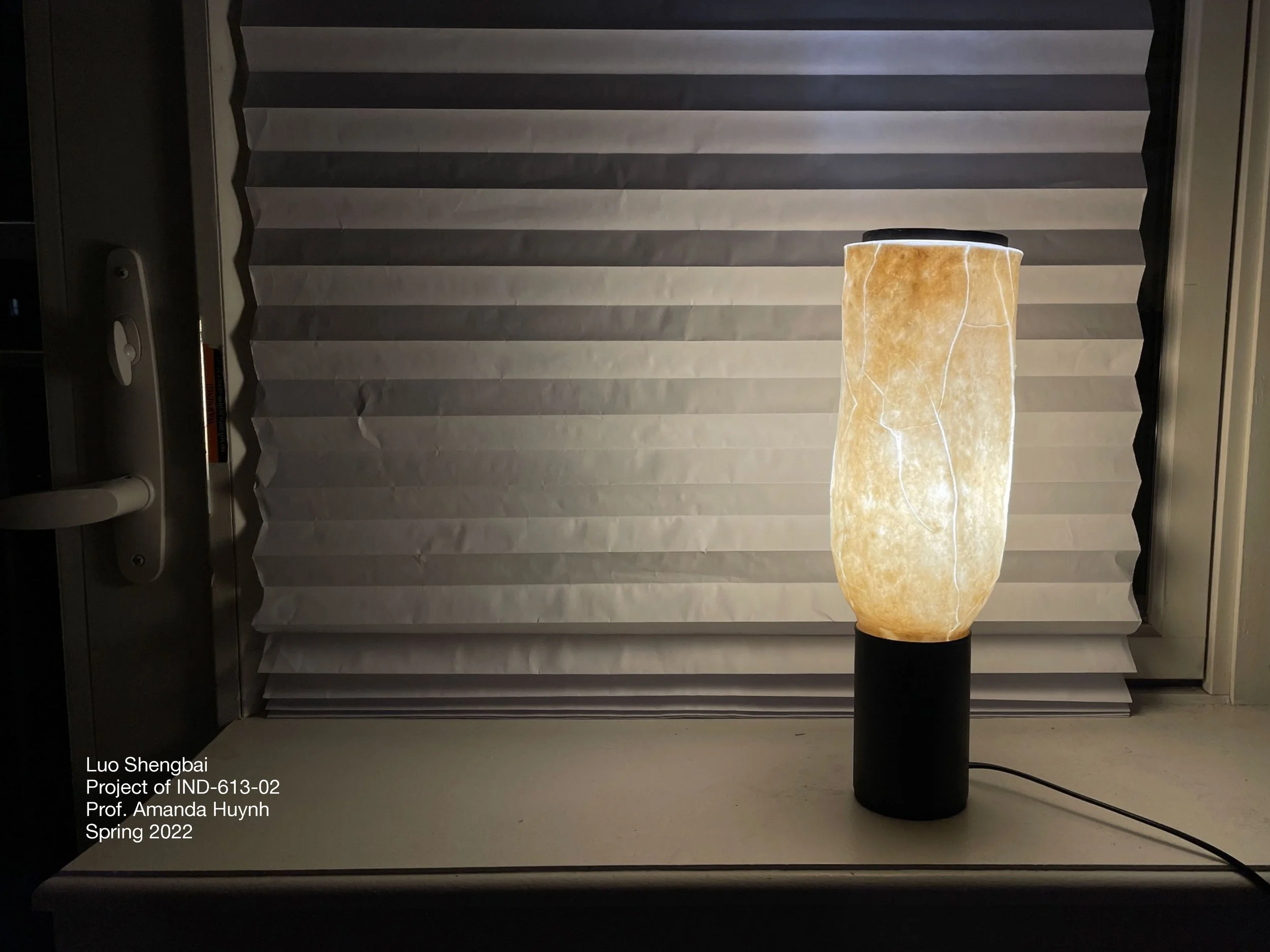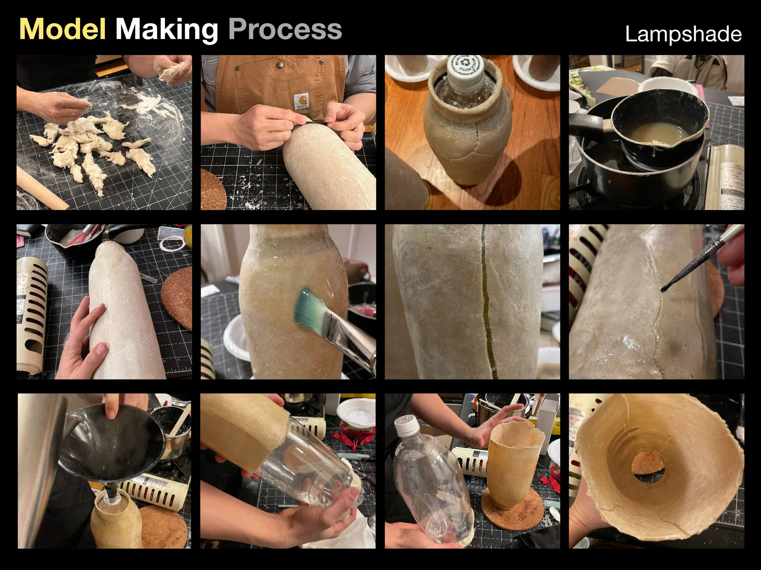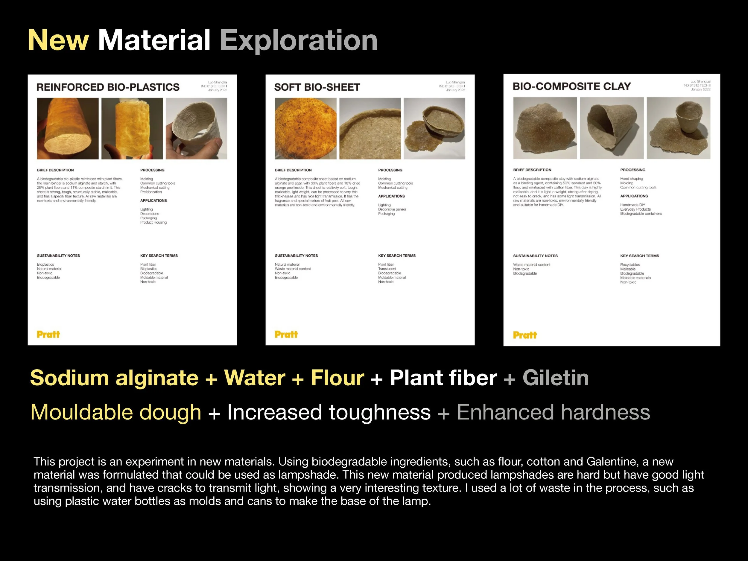 This project is an experiment in new materials. Using biodegradable ingredients, such as flour, cotton and Galentine, a new material was formulated that could be used as lampshade. This new material produced lampshades are hard but have good light transmission, and have cracks to transmit light, showing a very interesting texture. I used a lot of waste in the process, such as using plastic water bottles as molds and cans to make the base of the lamp.