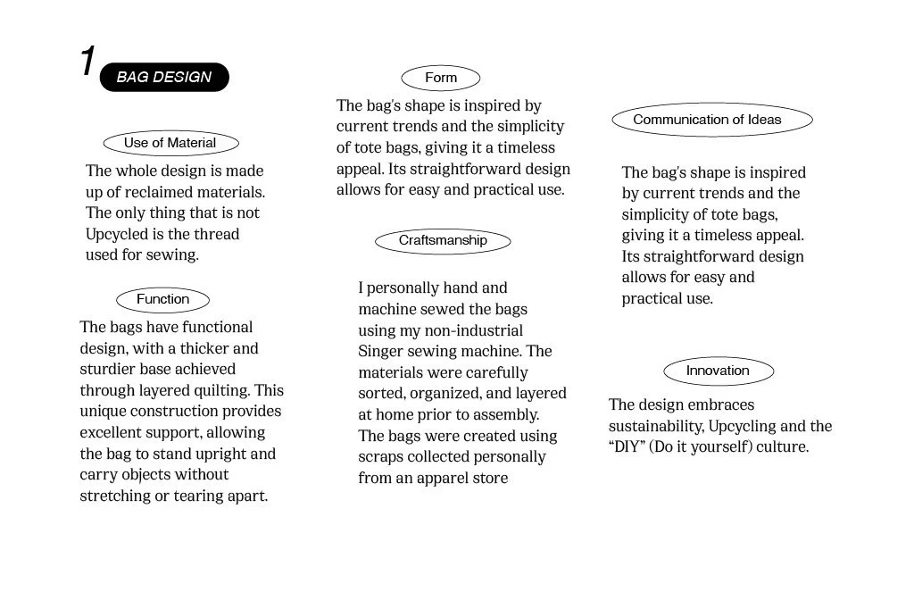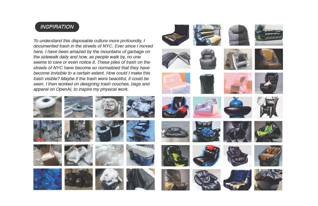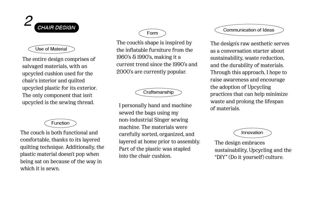 I gathered plastic scraps and utilized quilting and sewing techniques to transform them into a flexible yet sturdy material that enabled the creation of a zero-waste bag and couch chair. These products not only exhibit functionality and trendiness but also highlight the significance of our waste, the longevity of our discarded materials, and the unlimited potential of Upcycling. My intention is to create awareness about the value of our trash and encourage the adoption of Upcycling practices to reduce waste and prolong the life of materials.